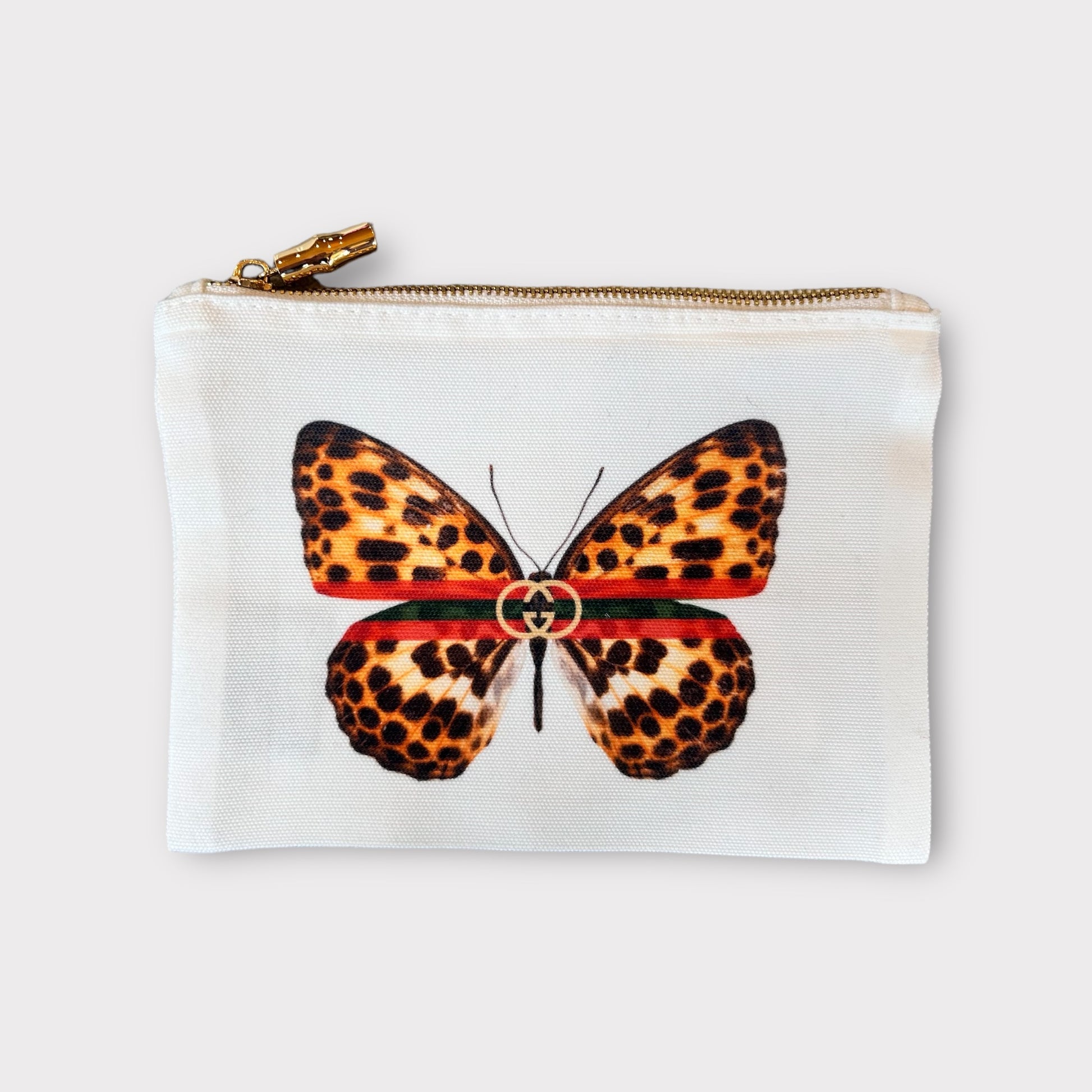 The exterior of the Butterfly Designer Inspired Zipper Bag showcases intricate butterfly motifs, reminiscent of nature's beauty, rendered in vibrant colors that exude charm and sophistication. The design is a testament to artistic creativity, offering a unique blend of whimsy and luxury.