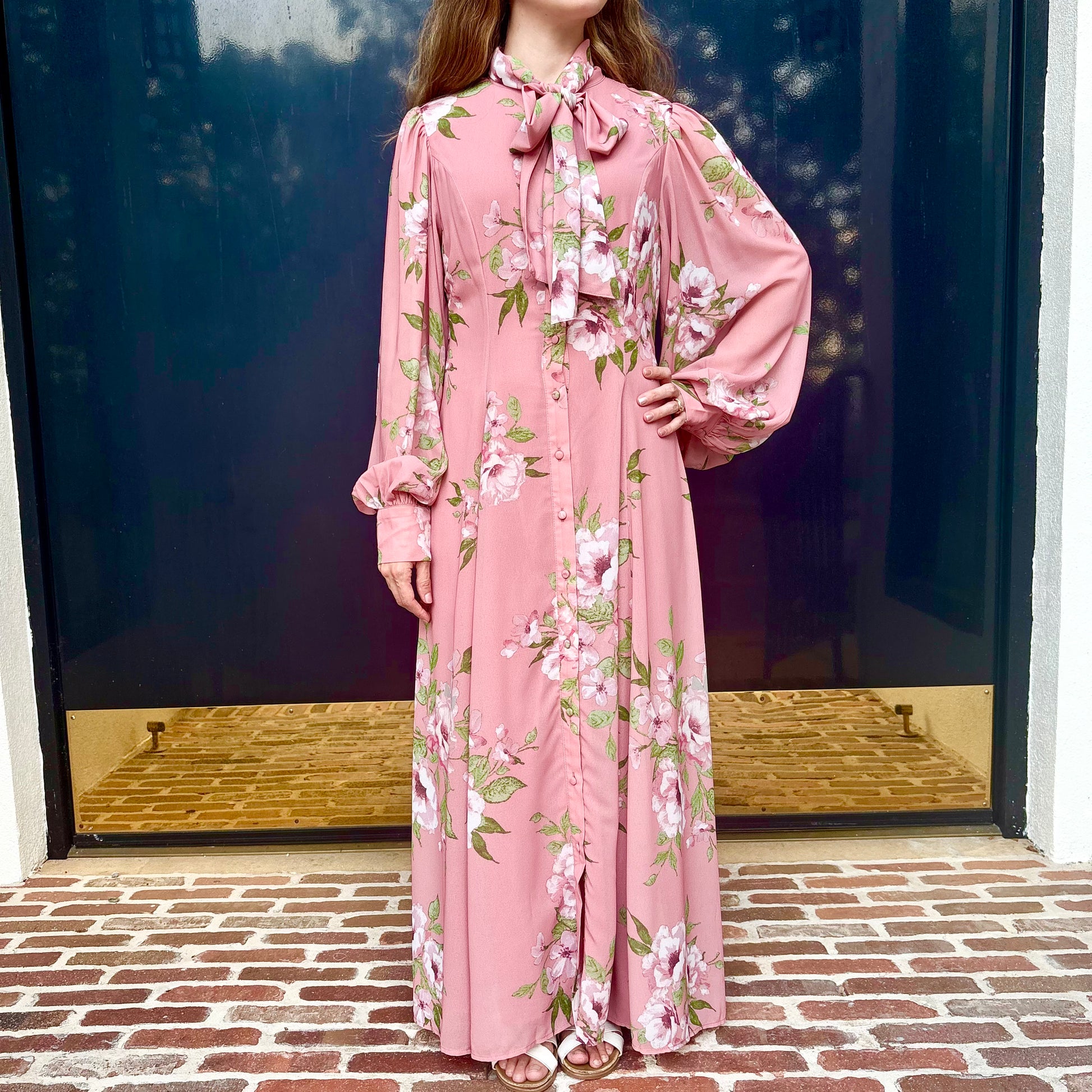 The tie high neck and long sleeves add a refined, vintage-inspired touch, while the full button-down front brings a modern twist to classic elegance. Lightweight and airy, the chiffon fabric drapes beautifully, making the Rosabelle perfect for garden parties, weddings, or any occasion where effortless sophistication is key.