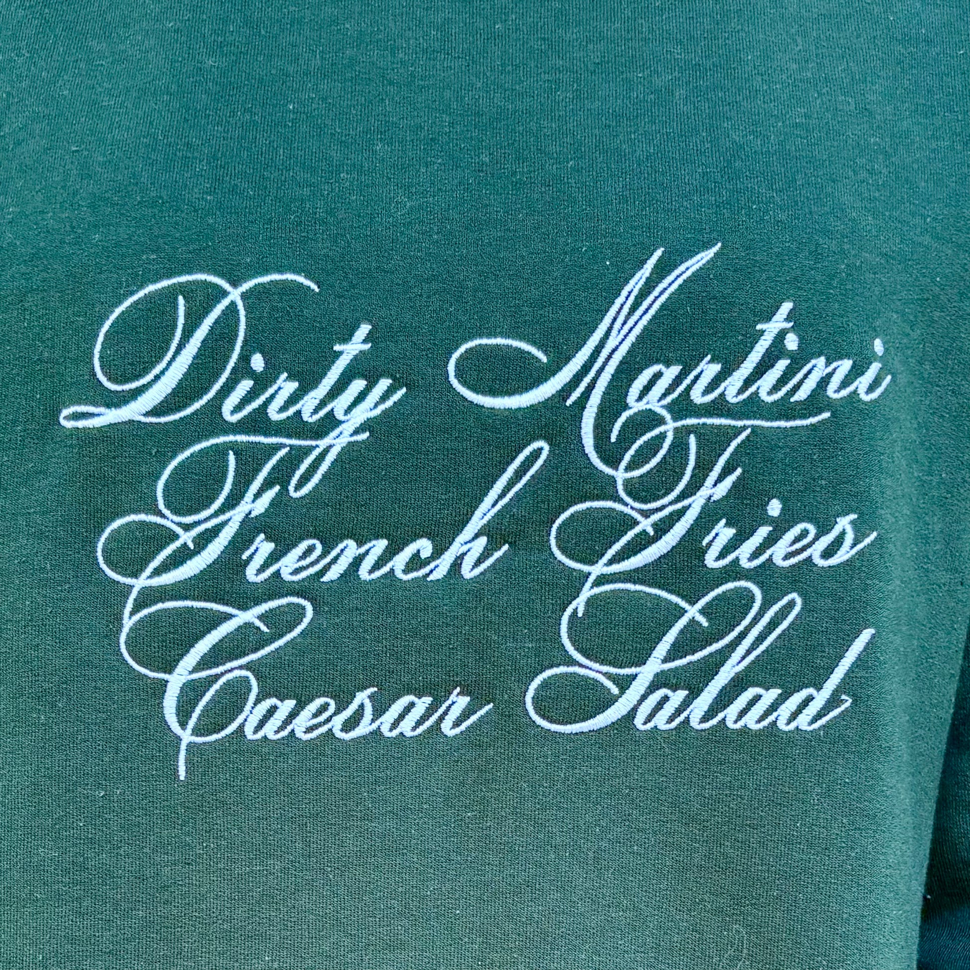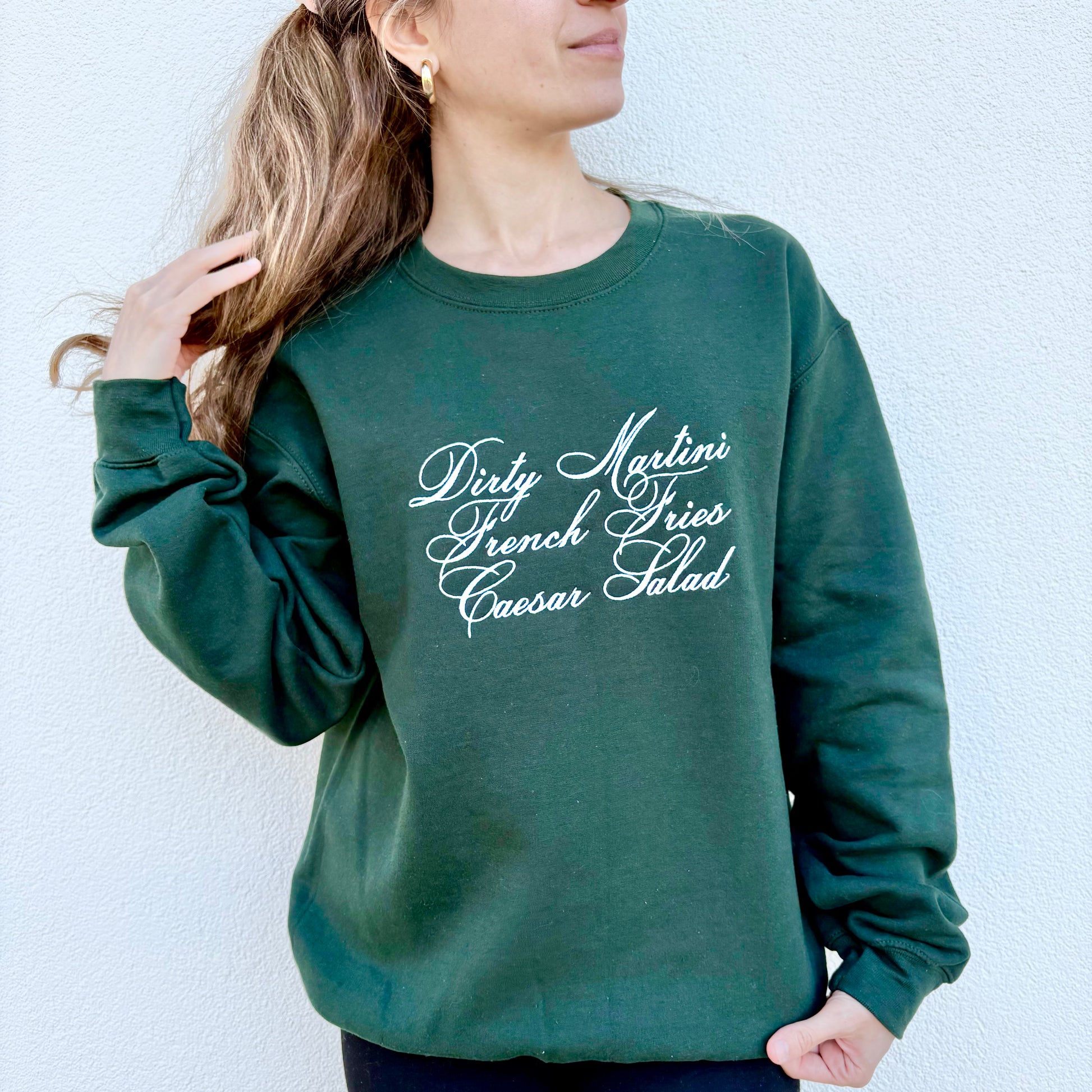 For the girls who crave a little flavor in their wardrobe—meet our Savory Lovers Sweatshirt. This cozy hunter-green pullover features playful white embroidery that reads Dirty Martini • French Fries • Caesar Salad… because sometimes your personality is your favorite order.